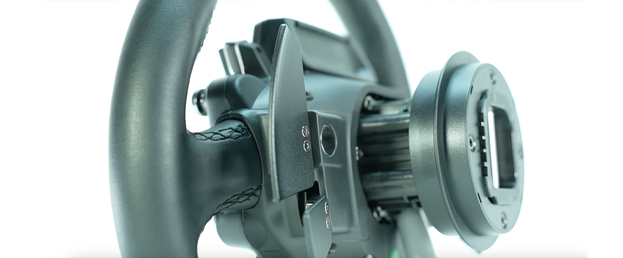 Back here, you’ll also find the magnetic paddle shifters. These are 3mm thick and made of black anodized aluminum, which gives them a nice feel. They’re also very clicky and responsive, giving me ample feedback of when I had shifted. Not evenly aligned with the paddle shifters, the two analogue clutch paddles are found below, and they do have enough travel and quite a bit of resistance.